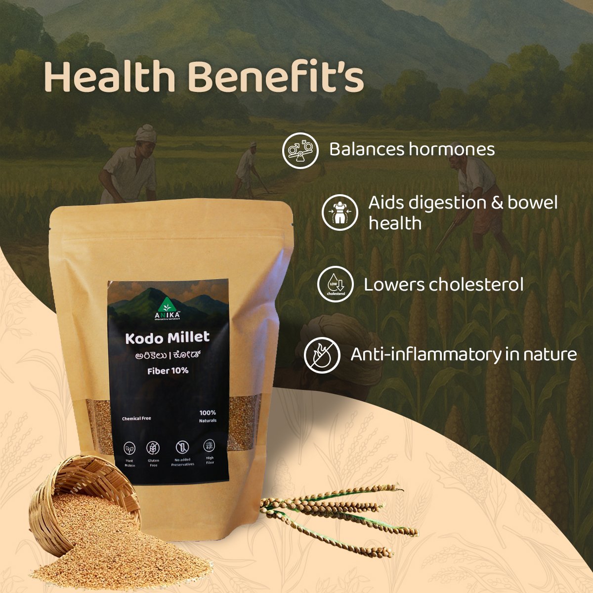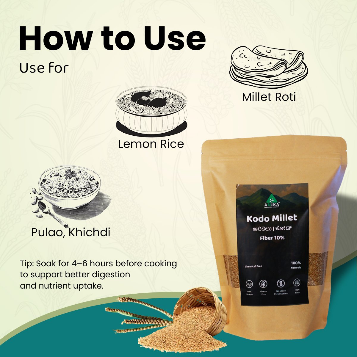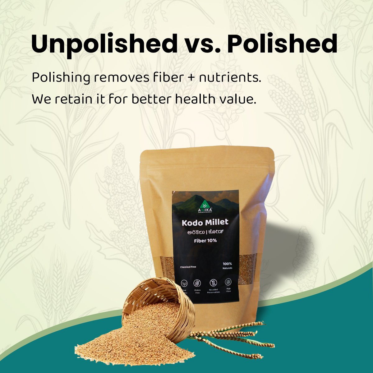 Kodo millet is known for its anti-diabetic properties and is one of the most fiber-rich millets. Our unpolished kodo millet is untouched by bleach or polish.