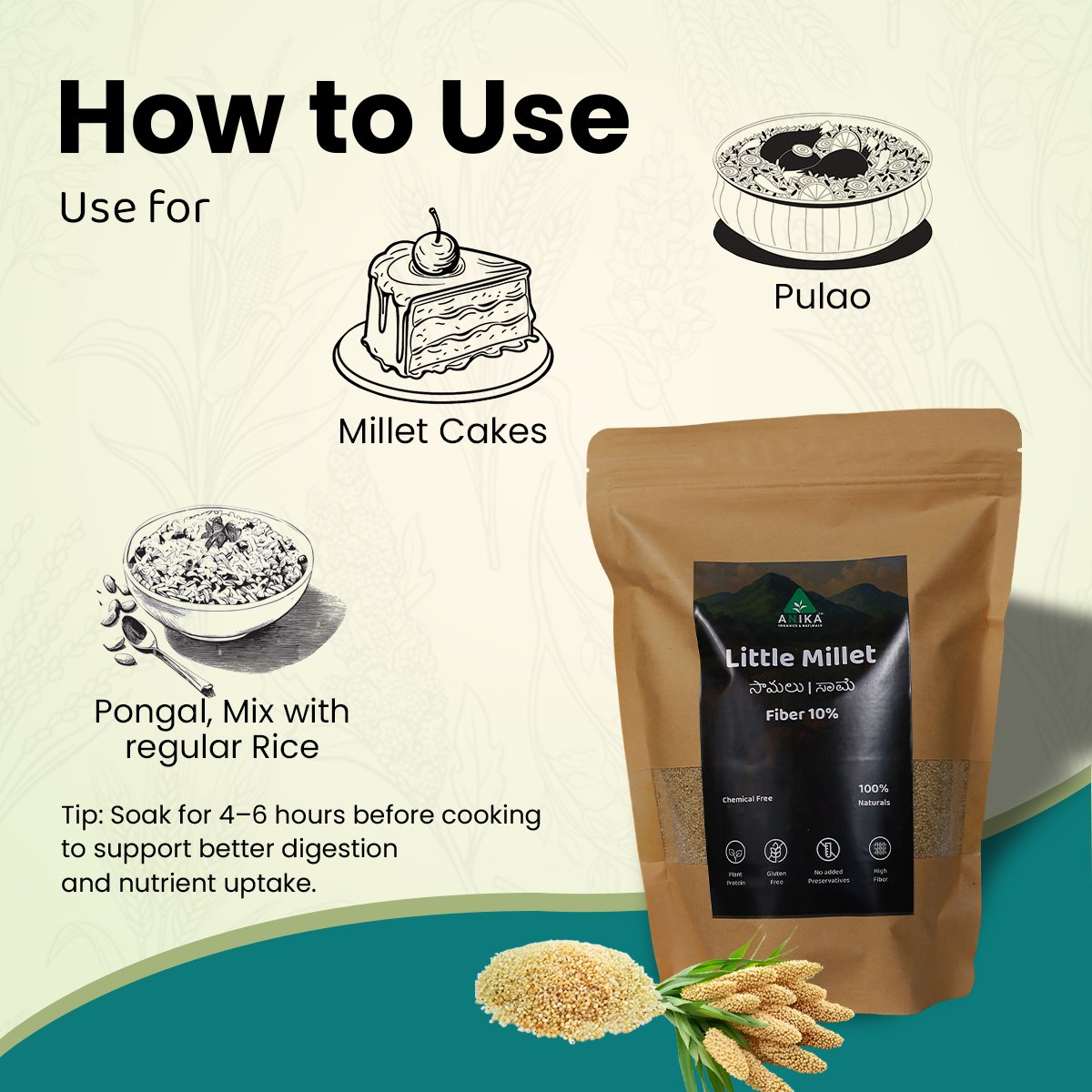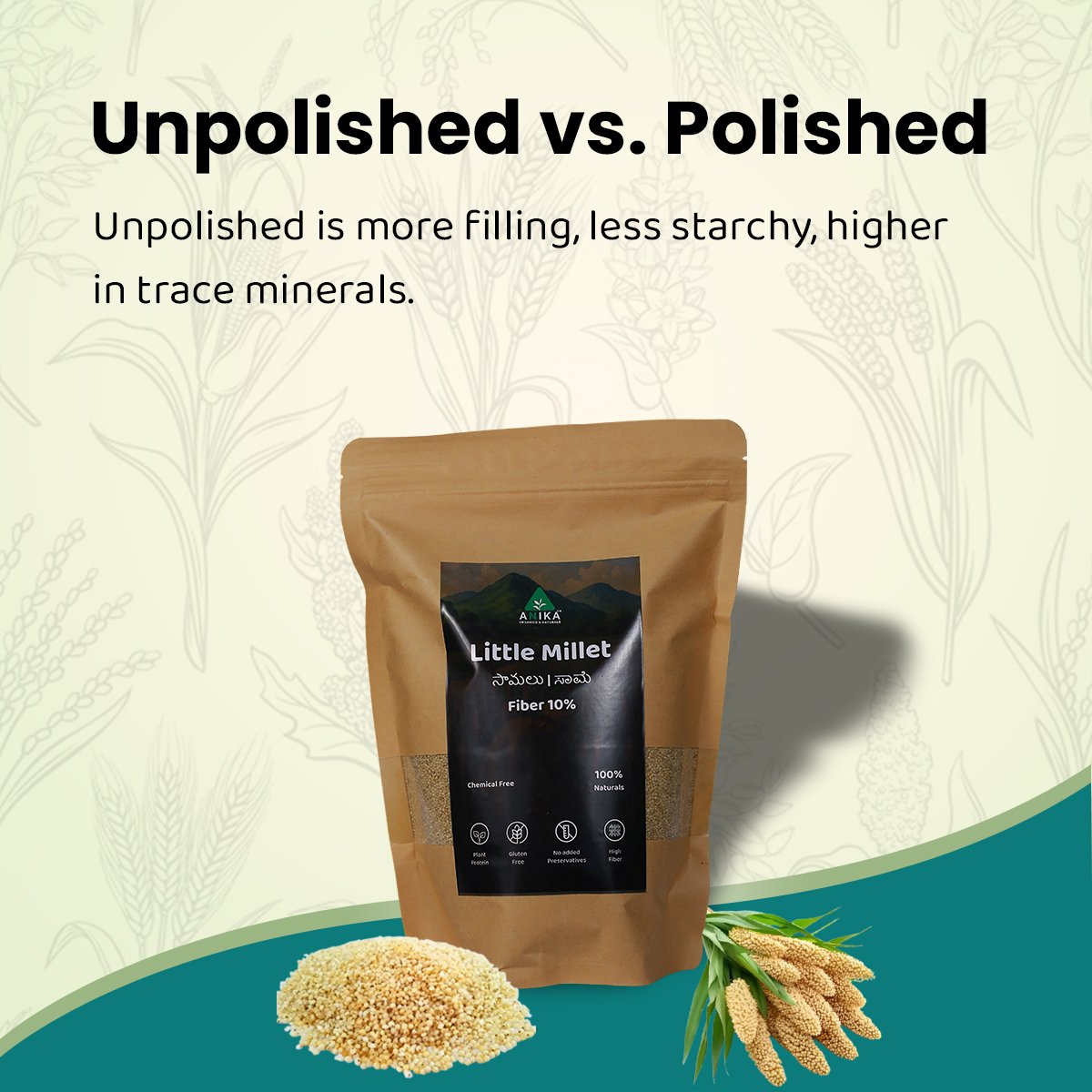 Little millet is a small-grain millet with mild taste and quick cook time. Our unpolished variety offers high iron and dietary fiber content.