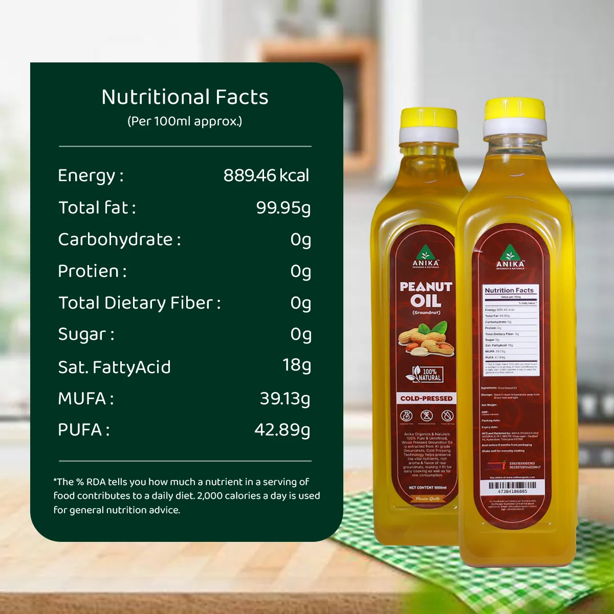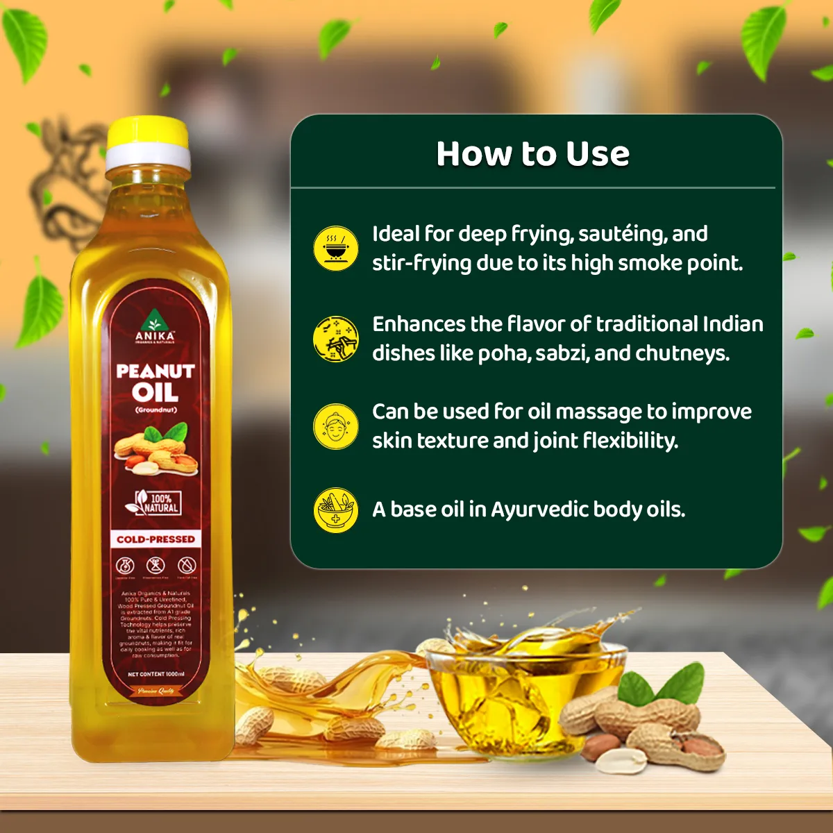 Cold-pressed peanut oil is extracted from high-quality groundnuts using the traditional wood-pressed method, without applying heat or chemicals. This slow, natural extraction retains the oil’s nutrients, aroma, and authentic flavor. Also known as “kacchi ghani” oil in India, it’s a popular choice for healthy cooking.